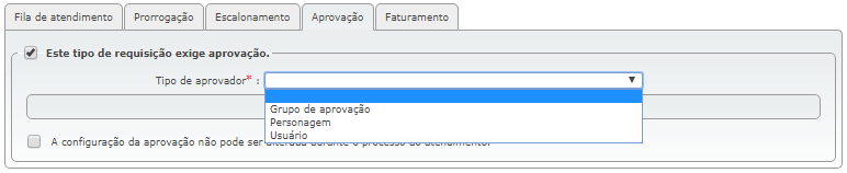 Caso seja habilitada o parâmetro "A configuração de aprovação não pode ser alterada durante o processo de atendimento", somente os atendentes selecionados estarão aptos a aprovar as requisições deste tipo, caso contrário poderá ser mudado o fluxo de aprovação no momento da operação.