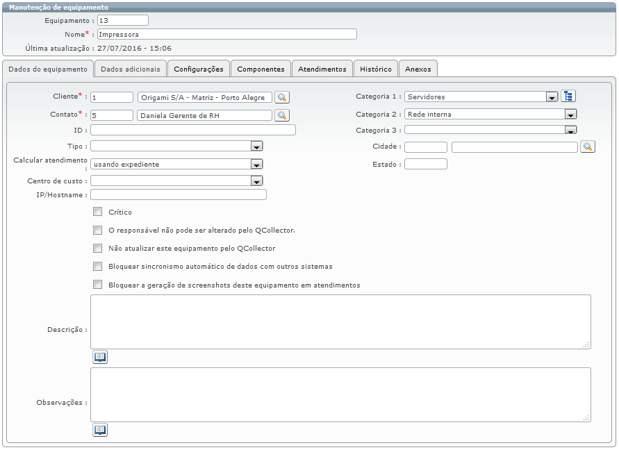 Os campos Cliente e Contato serão preenchidos automaticamente pelas informações registradas no cadastro do equipamento, porém o atendente poderá alterar estas informações caso seja necessário.