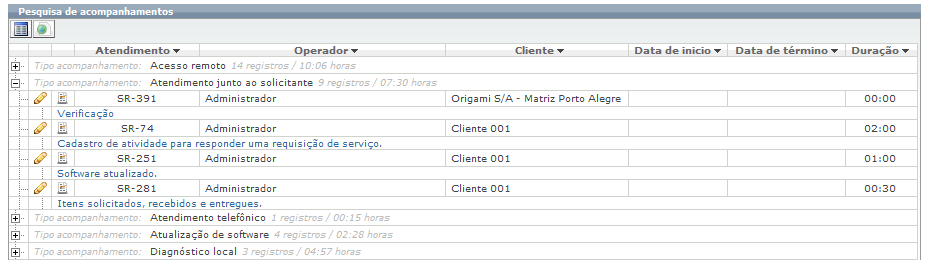 Todas atividades cadastradas são mostradas no histórico da requisição; atividades são contabilizadas e é possível saber quais atividades foram executadas por cada atendente (ou equipe) e quando tempo foi gasto em cada tipo de acompanhamento.