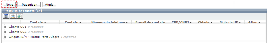 Após realizar a pesquisa, basta clicar no botão “Novo”, no topo da tela de clientes, conforme indicado na imagem abaixo: