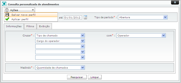 << <%SKIN-STRTRANS-SYNTOC%> >> Navegação: ATENDENTE > Relatórios e gráficos > Menu “Consultas personalizadas” > Operações em Consulta Personalizada > Criando Perfis |