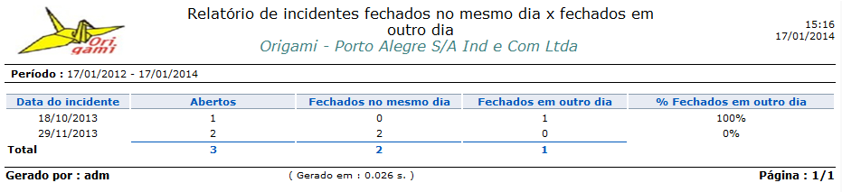 Conforme imagem anterior do relatório, é possível visualizar-se quantos incidentes foram abertos em cada dia e destes, quantos foram encerrados (junto com os respectivos percentuais).