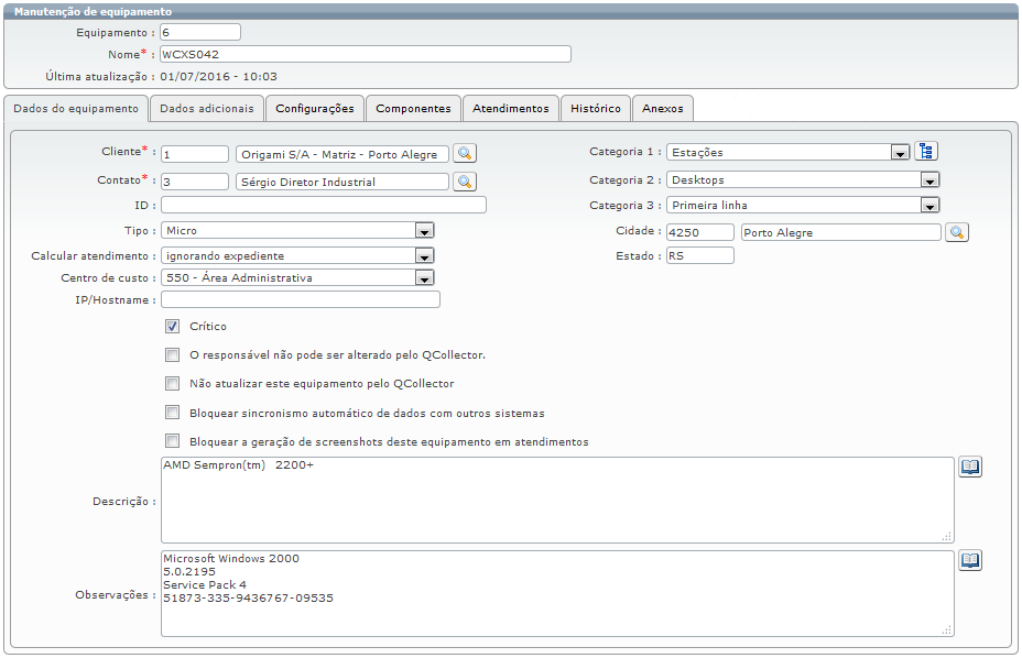 Nesta guia o atendente deverá registrar alguns campos obrigatórios, como o cliente e o contato responsável pelo equipamento. Também ficará registrado a data e o horário da última atualização dos dados deste equipamento.