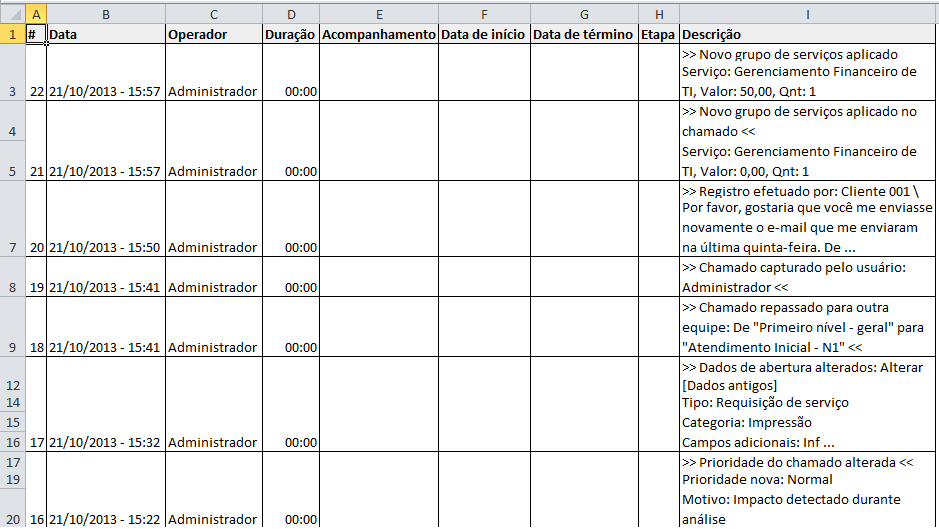 A seguir, você encontrará um exemplo da subguia “Histórico” quando aplicada a requisições de serviço.