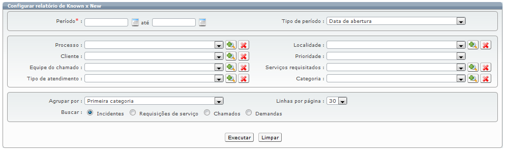 Além dos filtros tradicionais sobre os incidentes, requisições e chamados, também é possível configurar o relatório para ser apresentado por diferentes tipos de agrupamentos: "Primeira categoria", "Categoria completa" e "Tipo de atendimento".