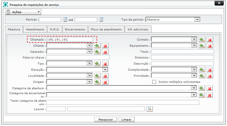 Primeiro, você deve adicionar filtros de busca. Uma das opções de filtro é através do campo “Chamado”, no qual é possível inserir vários códigos de números de requisições de serviço, separados por vírgula, para facilitar a pesquisa de requisições de serviços. Observe o exemplo a seguir: