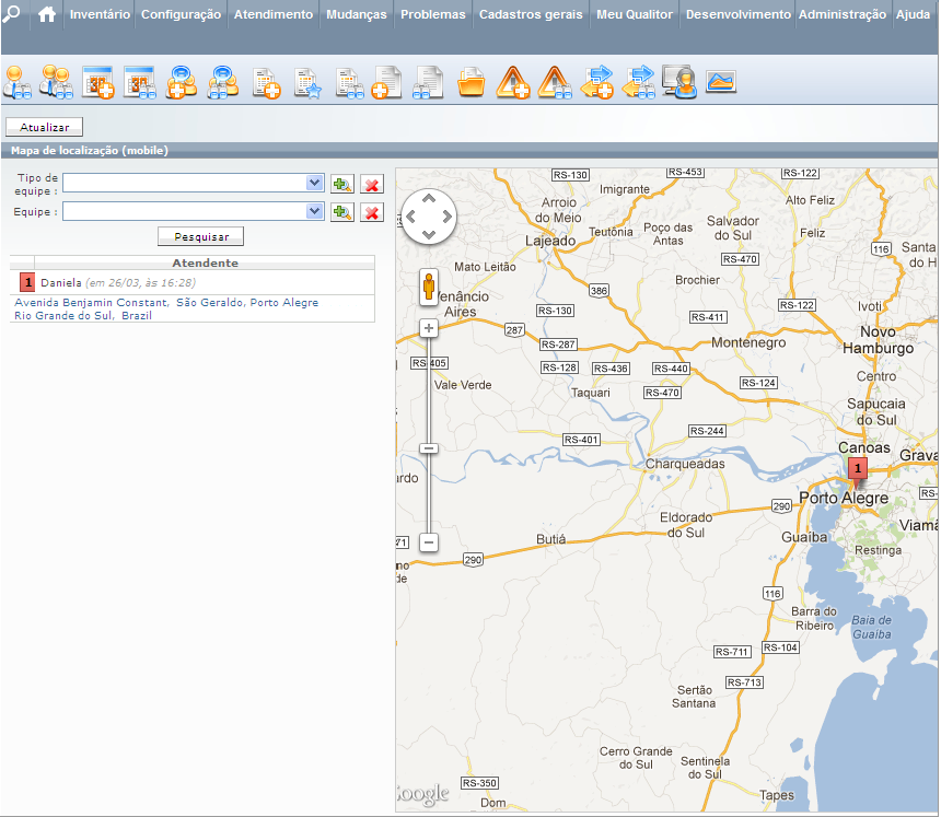 Esta funcionalidade permite a monitoração de informações de posicionamento de atendentes que iniciaram e/ou encerraram chamados através do Mobile. As informações de latitude e longitude do local serão enviadas pelo próprio mobile através do login do atendente.