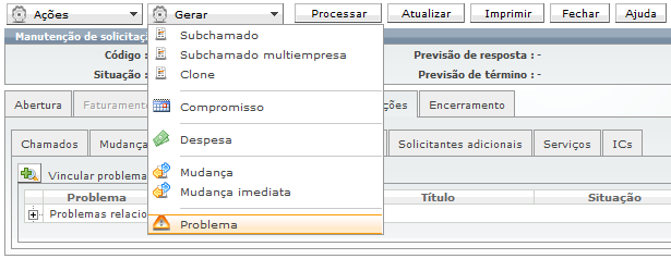 Essa ação pode ser feita clicando em “Gerar / Problema” (menu da tela da requisição):