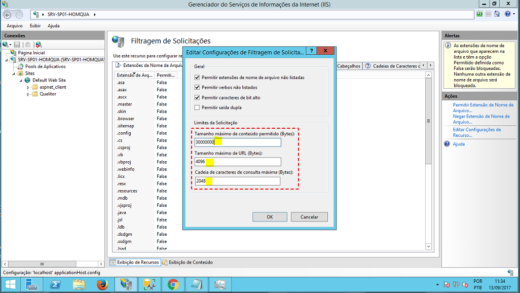 4.Insira um "0" no final de cada um dos três campos, conforme destaque na imagem abaixo. No final, reinicie o serviço do IIS.