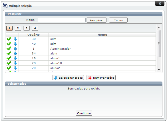), o Qualitor apresentará uma tela onde todos os usuários passíveis de serem vinculados á este projeto, estarão descritos e poderão ser selecionados.