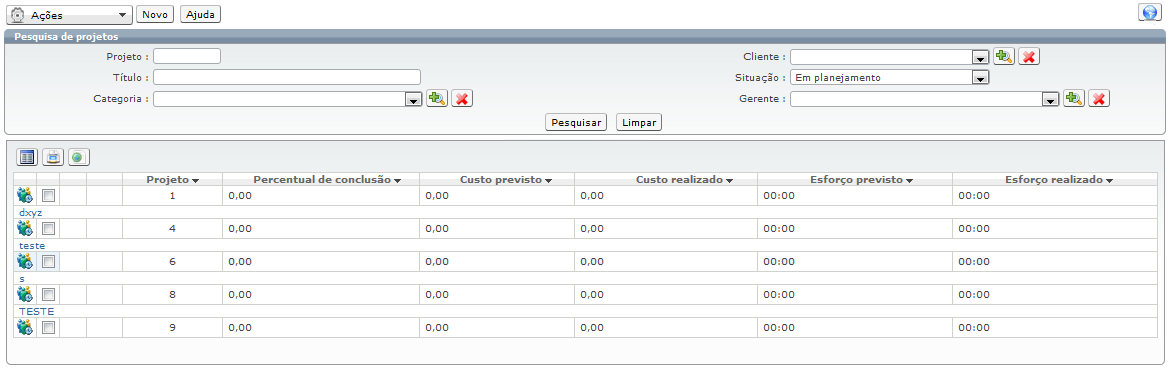 Quando um projeto está sendo criado, sua situação ficará “Em planejamento”. Ao clicar nesta opção de gerenciamento de projetos no menu “Recursos / Projetos / Gerenciamento de projetos / Projetos em planejamento”, será exibida a tela de pesquisa somente com os projetos na situação “Em planejamento”: