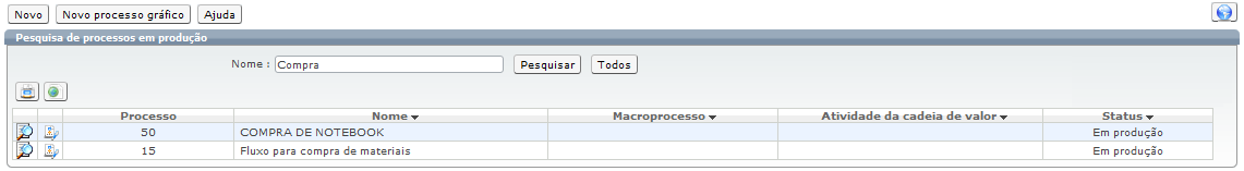 Ao abrir a tela referente aos processos em produção, aparecerão todos os processos encontrados nesta situação. Para nosso exemplo, escolheremos um processo referente a uma compra de um notebook a ser realizada, por isso no campo "Nome", digitaremos a palavra "compra" e clicaremos em "Pesquisar" para que o Qualitor mostre o processos disponíveis a serem usados. No caso, o nosso exemplo usará o processo "COMPRA DE NOTEBOOK", veja abaixo: