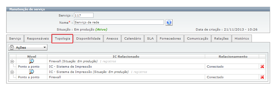 Já a topologia de IC’s é exibida dentro do cadastro de serviços de tecnologia.