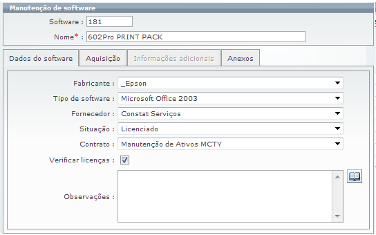 << <%SKIN-STRTRANS-SYNTOC%> >> Navegação: ITIL GERENCIAMENTO DE CONFIGURAÇÃO > Configuração > Menu "Softwares" > Softwares > Guia "Dados do Software" |