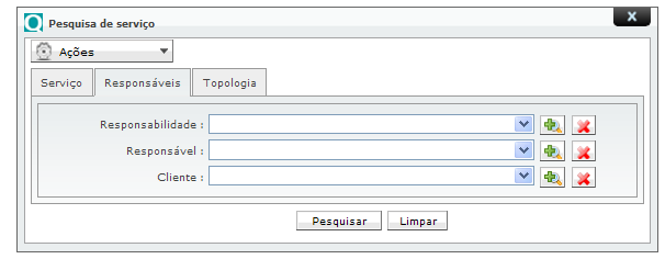 Além dos argumentos básicos apresentados na aba inicial “Serviço”, podem ser utilizados como argumento os “Responsáveis” e dados de “Topologia”. A guia “Responsáveis” tem o seguinte aspecto: