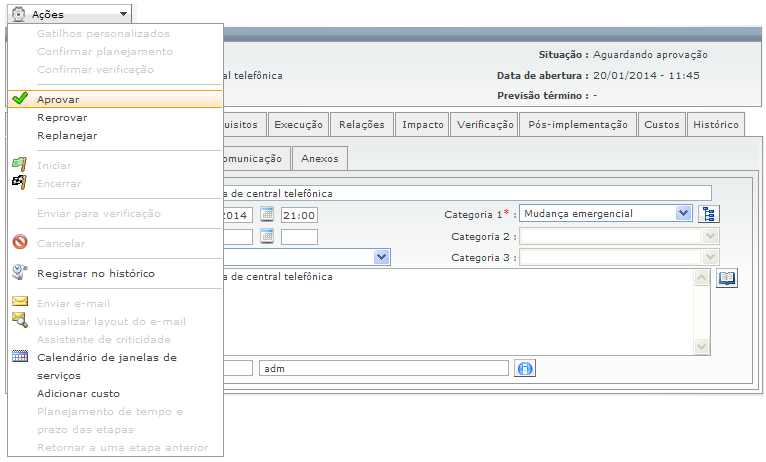 Os grupos de aprovação e comitês são definidos com base na categoria sendo utilizada. Neste caso, um usuário pertencente a um grupo de aprovação definido na categoria pode aprovar a mudança sem o comitê se reunir.