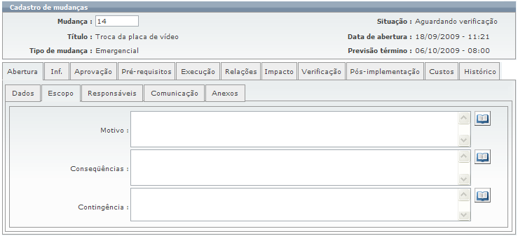 Nesta subguia são inseridos “Motivo”, “Consequência” e “Contingência” para a mudança. A contingência, termo também conhecido com “rollback”, consiste em um plano com instruções sobre o que fazer para retornar à situação anterior à mudança, caso algo dê errado.