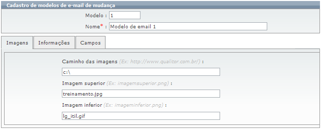 Os modelos de e-mail do gerenciamento de mudanças são idênticos aos modelos do Qualitor. Nele, são definidos imagens superior e inferior, texto superior e inferior para abertura e encerramento de mudanças e ainda quais os campos serão encaminhados juntamente com a comunicação.