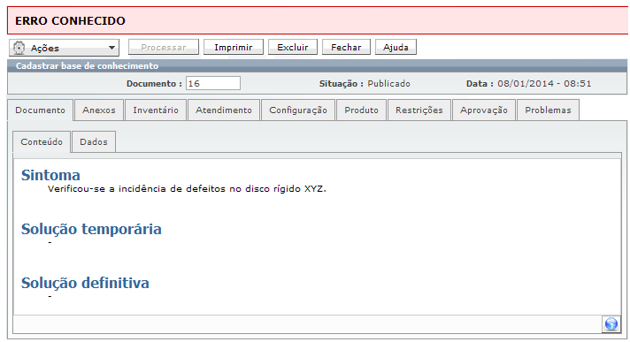 No problema, as alterações descritas nos campos de “Solução temporária” e “Solução” (que é a própria solução definitiva) alimentam o documento da base que contém o erro conhecido: