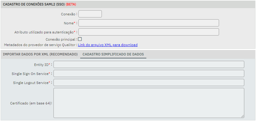 A configuração de SAML2 no Qualitor é feita através do menu "Administração/Avançado/Conexões/Conexões SAML (SSO)".