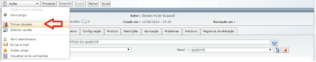 Para tornar um artigo obsoleto, basta que um editor ou revisor utilize a opção “Tornar obsoleto” dentro da própria edição do artigo: