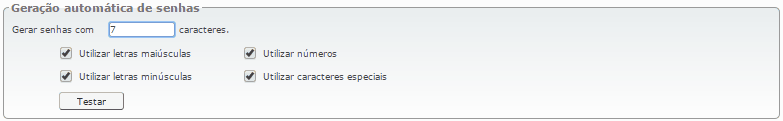 Ao clicar no botão “Testar” o sistema mostra uma senha gerada utilizando esta configuração marcada: