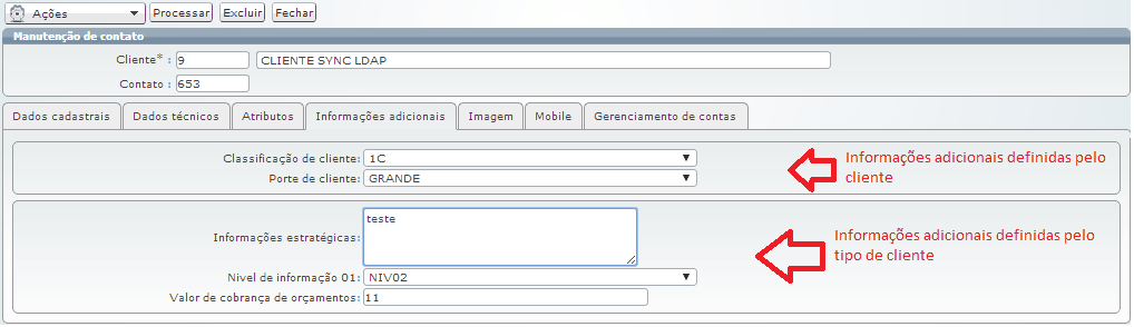 Veja que as informações adicionais podem ser associadas tanto para “Clientes” quanto para “Contatos”.