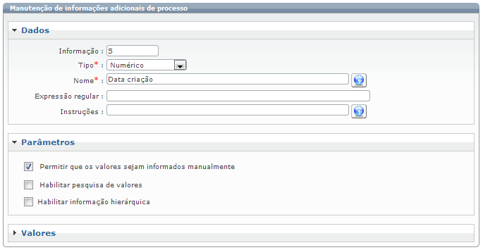 << <%SKIN-STRTRANS-SYNTOC%> >> Navegação: Manual de PROCESSO > Cadastros básicos do Processo > Informações Adicionais > Collapse "Parâmetros" |