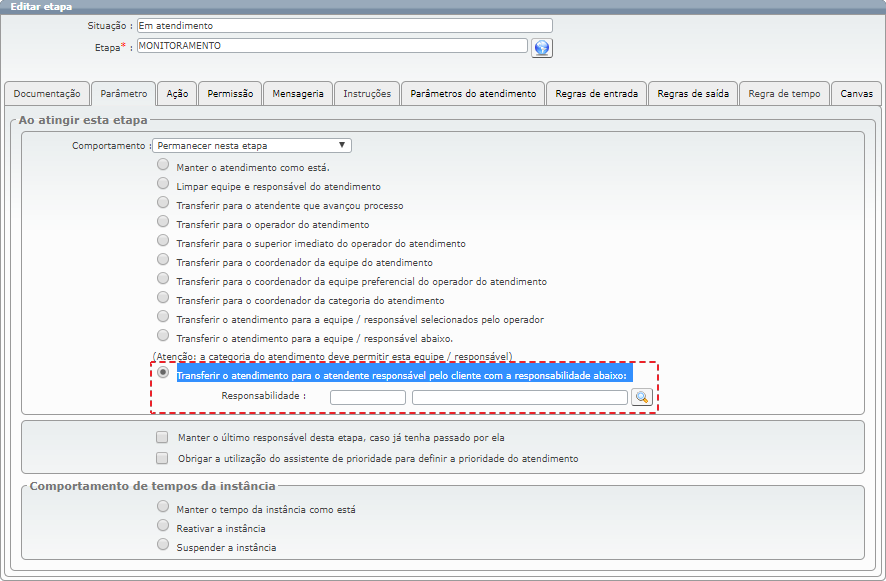O comportamento “Permanecer nesta etapa” possibilita várias opções para determinar como aquela etapa dará continuidade ao atendimento da requisição, realizando as atividades necessárias para o cumprimento desta etapa.