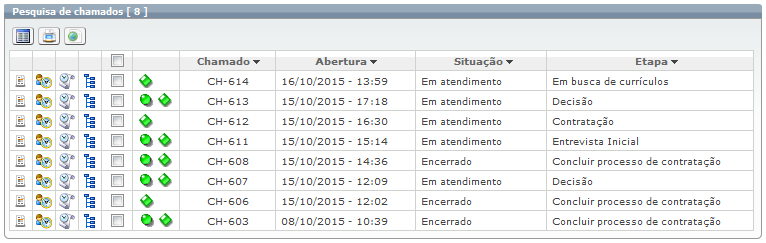 Como resultado da pesquisa, a grid de atendimento mostrará os chamados com processo e poderá ser visualizado os indicadores configurados: