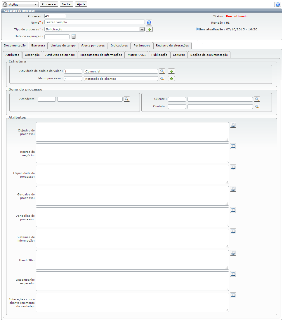 Os processos ficam com o "Status Descontinuado" quando há necessidade de alteração e então é gerada uma revisão do processo, que depois de concluída assumirá o lugar deste processo e ele ficará automaticamente com o "Status Descontinuado".