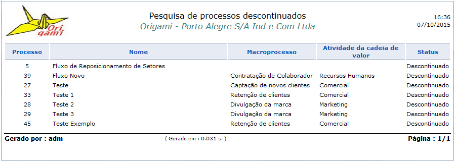 A pesquisa de processos "Descontinuados" traz como resultado os processos que estão inativos, ou seja, os processos que não podem mais serem utilizados.