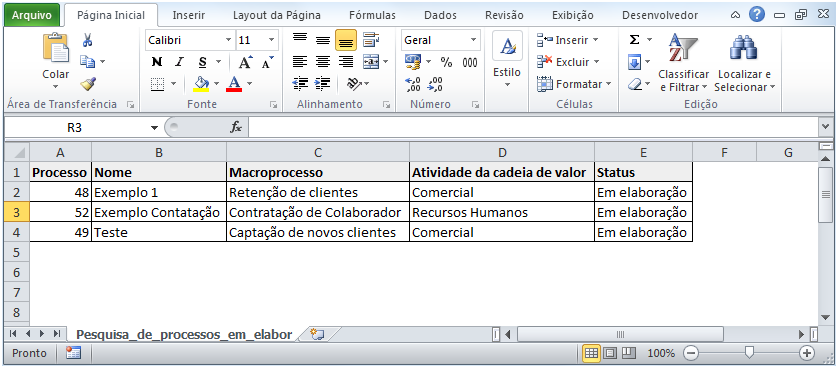 A pesquisa de processos "Em elaboração" traz como resultado os processos que estão em desenvolvimento, ou seja, os processos que estão sendo construídos e que ainda não estão disponíveis para serem utilizados.