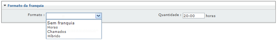 O “Formato de Franquia” tem por função definir a forma de contratação da franquia e seu decremento. O “Formato” pode ser definido em horas, chamados ou híbrido, conforme o apresentado na imagem a seguir: