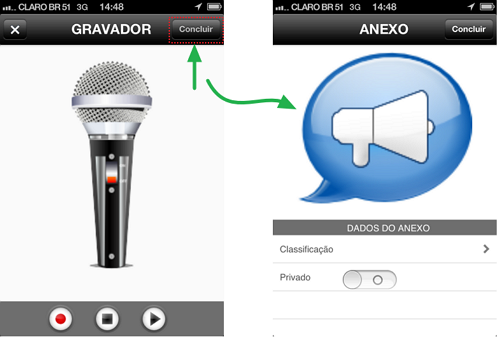 Navegação:  QMOBILE > Acessando Chamados > Visualização > Acessando Chamados - “Menu de Contexto” > Registrar > Gravação de Áudio >