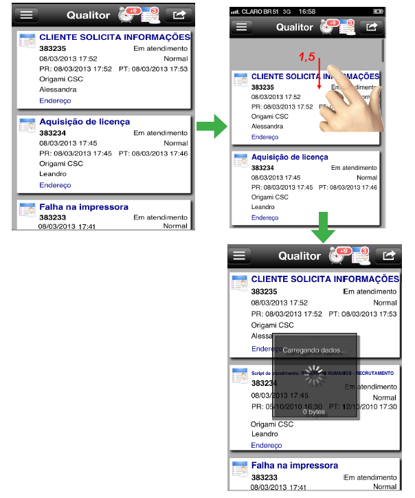 Caso o usuário deseje atualizar os chamados, basta que na tela principal se deslize seu dedo para baixo e o segure por 1,5s.