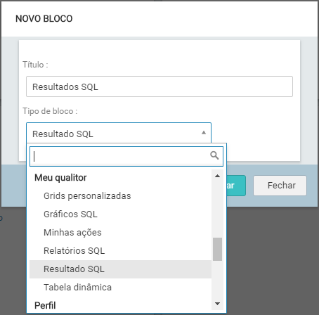Para fazer a configuração deste bloco, ao criar um "Novo Bloco" é preciso colocar um título e selecionar o tipo de bloco como "Resultados SQL":