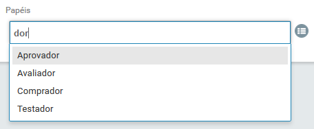Depois de digitar dois ou mais caracteres o sistema automaticamente faz a pesquisa e já sugere os "papéis" cadastrados para seleção, no exemplo abaixo, foi digitado os caracteres "dor" e os seguintes papéis foram sugeridos pelo sistema: