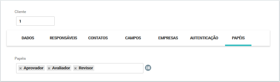 Na guia "Papéis" podem ser atribuídos papéis (também conhecidas como "roles") para este cliente, que serão utilizados posteriormentes em outros recursos do sistema. Esta guia tem o seguinte aspecto:
