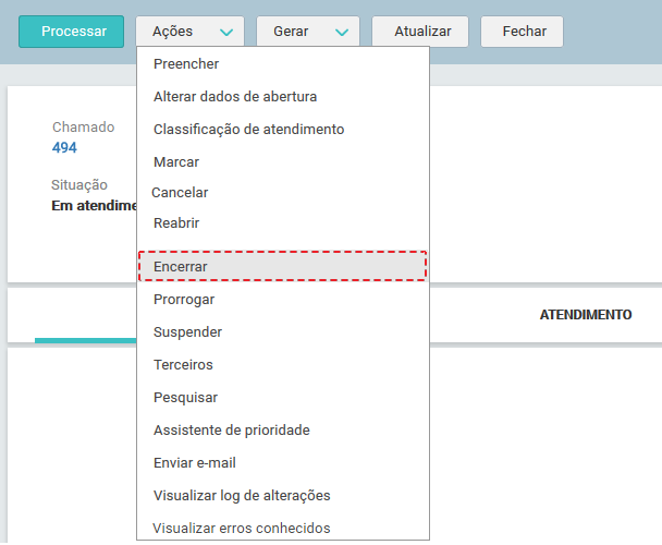 A partir do menu Encerrar, o Atendente pode finalizar um Chamado em atendimento.