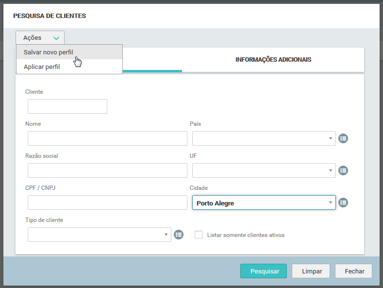 Como exemplo, foi utilizado o perfil "Clientes de Porto Alegre", no qual foi selecionado o checkbox "Listar somente clientes ativos" e então para salvar esta alteração no perfil, foi acessada a opção do menu "Ações / Salvar perfil (Clientes de Porto Alegre)":