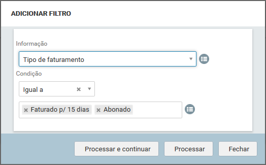 Ao selecionar uma informação adicional, se define também uma condição que será utilizada como critério associado a um valor que poderá ser selecionado (caso a informação possua valores cadastrados) ou então, informado manualmente, para que assim possa ser realizada a pesquisa de clientes. Como exemplo, foi selecionado a informação "Tipo de faturamento" e as condições disponíveis são as seguintes:
