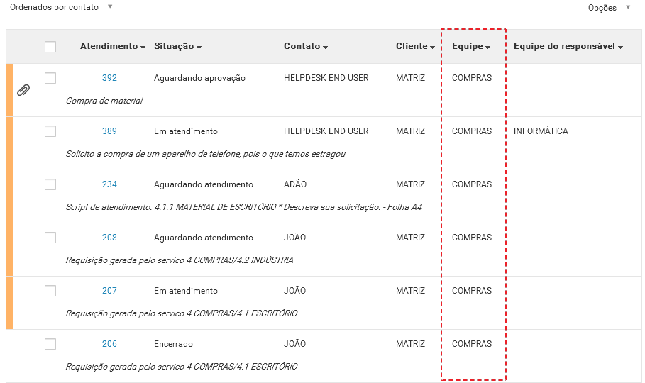 A simulação de causa e efeito refere-se a "Pesquisa" na guia Atendimento, a partir do campo Equipe.