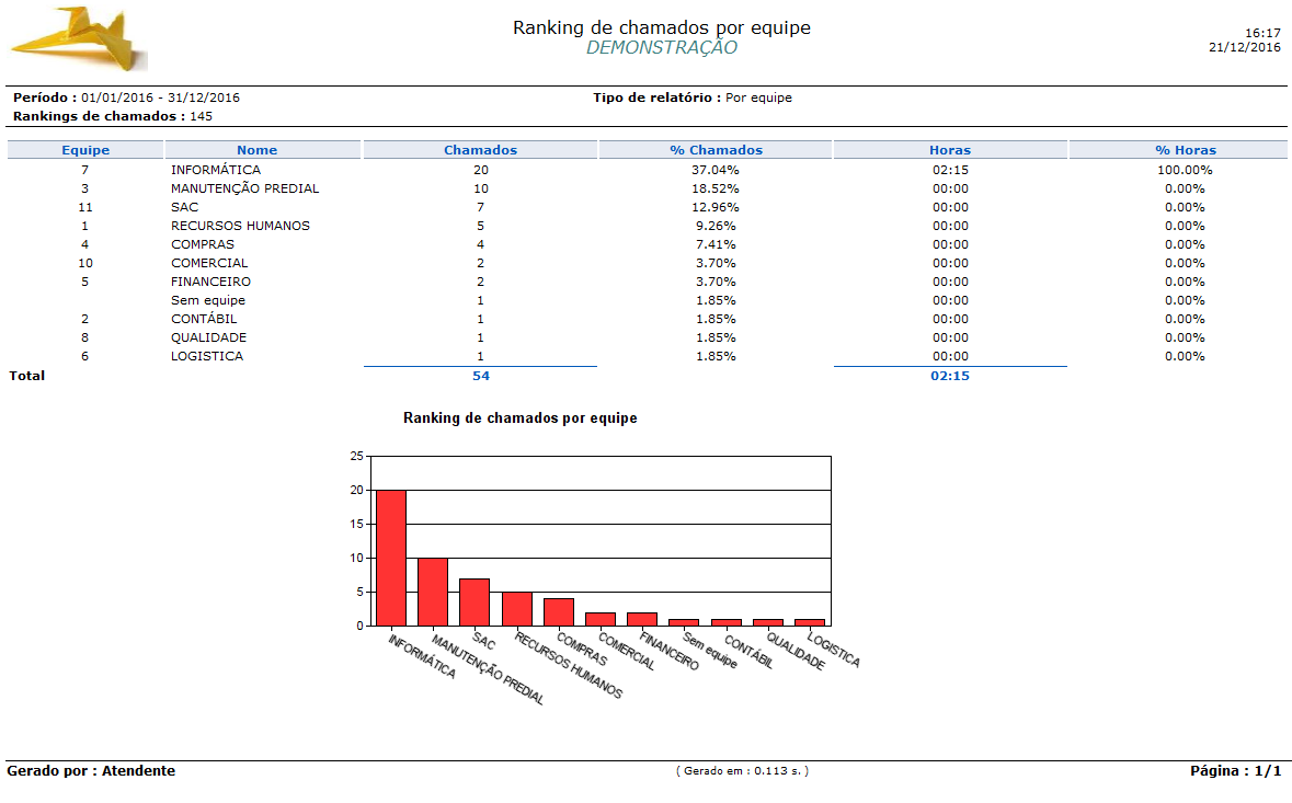 15.No campo Ranking por, selecione uma das opções "Quantidade de chamados" ou "Horas trabalhadas" para gerar relatórios a partir dessas informações;